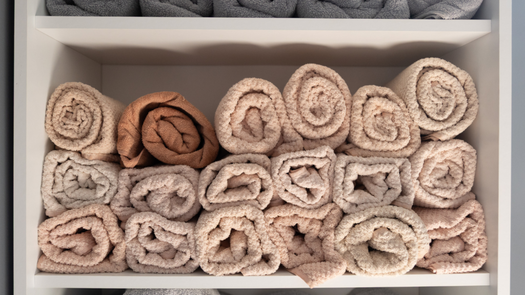 - Dobre as toalhas de forma uniforme: isso traz sensação de organização imediata e deixa o ambiente visualmente mais bonito e alinhado.
